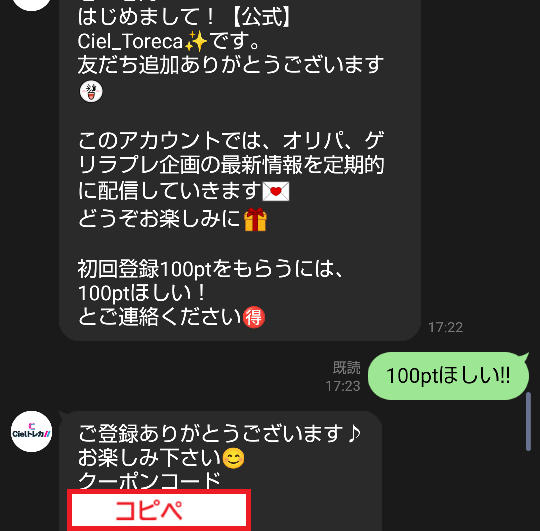「100ptほしい」とメッセージを送ると、クーポンコードが届きます。