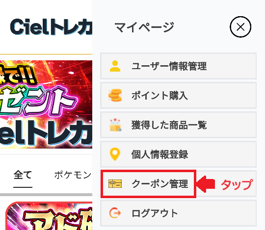 Cielトレカの公式サイトへ戻り、「クーポン管理」をタップ。