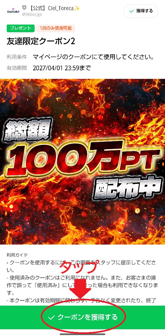 CielトレカではLINEでクーポン配布が不定期ですがされています。