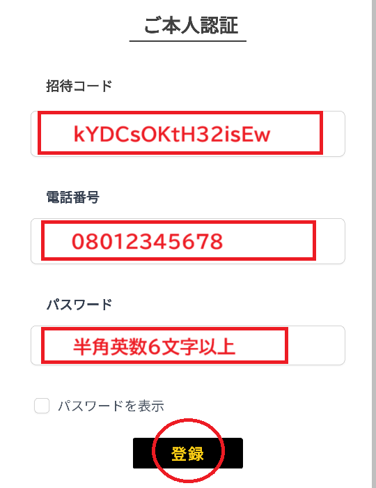- 招待コード、電話番号、パスワードを入力