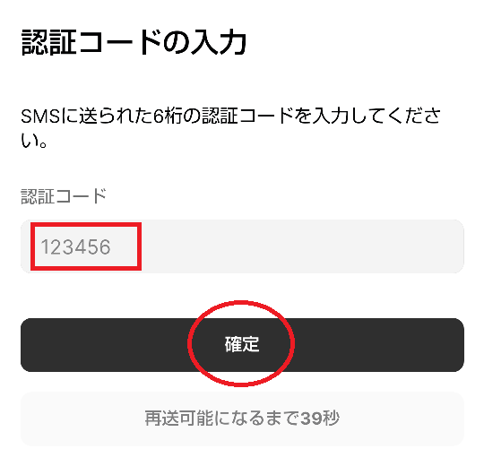 認証コードが送られてくるので、6桁の数字を入力し、「確定」をタップ。