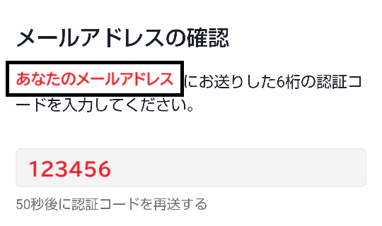 - メールアドレス宛に送られた6桁の認証コードを入力