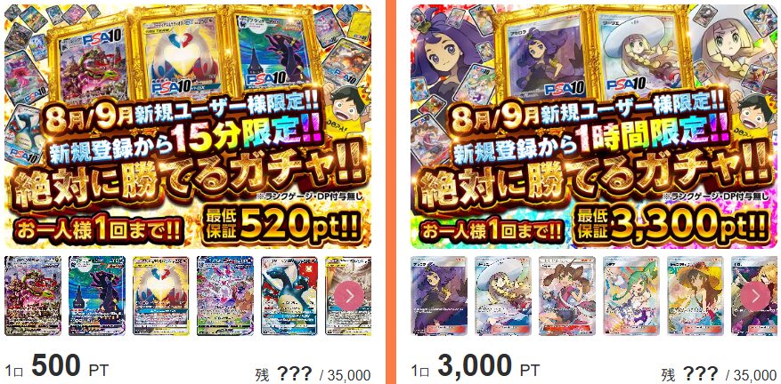 ➡ 総口数の多いオリパが多いため、当たりを引ける確率は高い。しかしポイント還元率が他のオンラインオリパショップと比較し少なめ。