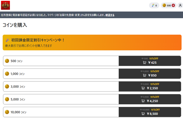 500コイン~購入でき、15%OFFで購入できてお得に初課金が可能に。
