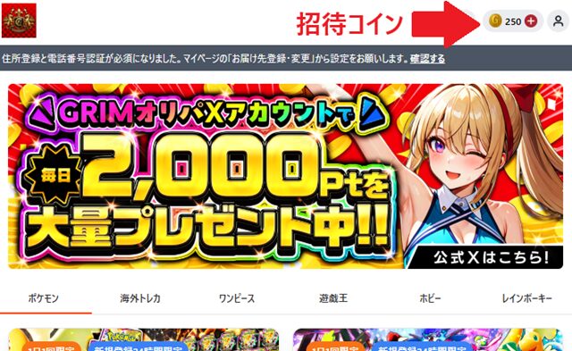 GRIMオリパには4月現在、期間限定で招待コードが復活中!クーポンは不定期配布のみとなっています。