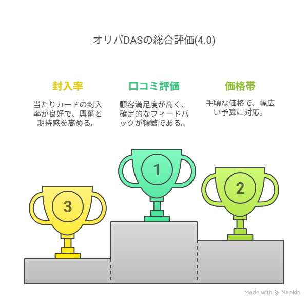 ➡ 口コミ、オリパの種類、価格帯、キャンペーン頻度、演出、使いやすさを総合的に評価。 - 口コミ評価