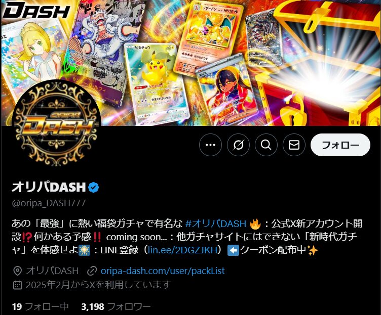オリパDASHは、発売から間もないにも関わらず「爆アド報告」が多いことが特徴です。還元率の高いガチャが多く、Xでも「当たりやすい」と評判になっています。