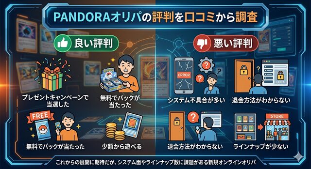 そこで今回は、最新のPANDORA(パンドラ)オリパの評判を徹底調査しました。無料オリパの有無や、気になる運営体制、SNSでの口コミまで、利用前に知っておきたい情報を余すことなくお届けします。