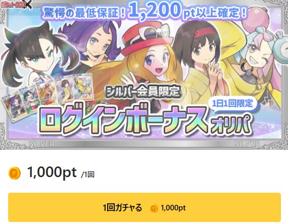 ランク別のものあり、ややこしいですが、新規登録者でもランクが一番下のシルバーのひとでも、このログインボーナスオリパは1,000pt→1,200pt以上になるのでめちゃくちゃお得。