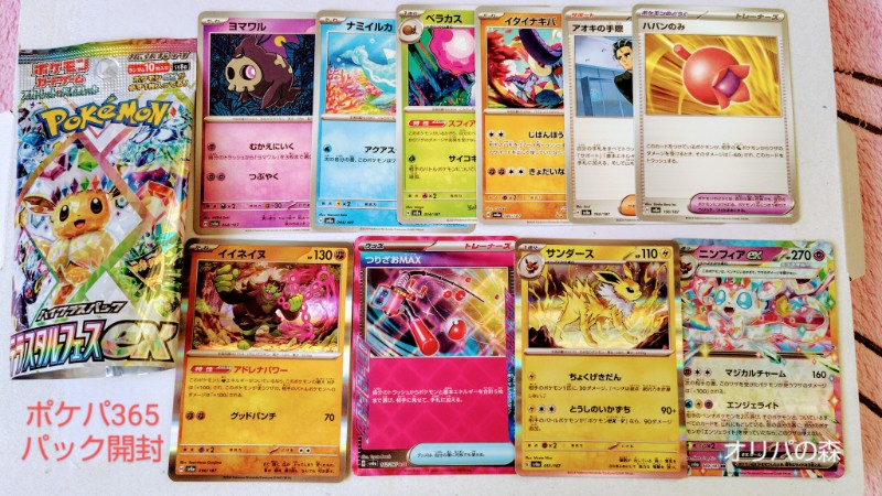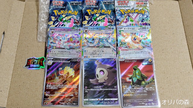 パックを開封すると、テラスタルフェスだったので確実にARやキラキラカードが入っていたんでしょうが、パックでもニンフィア出たw