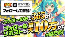 ポケパ365のX(Twitter)で当該ポストをRPすると、抽選で1名に365ptが当たる | 常時 |