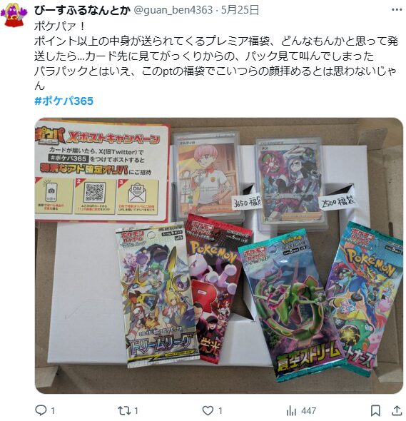 いろんな種類のポケカが当たったので楽しめました。