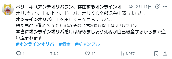 知恵袋には、課金額が100万円を超え、生活が破綻したという生々しいオンラインオリパの破産事例がいくつも転がっています。