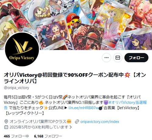 とくに公式LINEと公式X(@oripa_victory)は要チェックです。