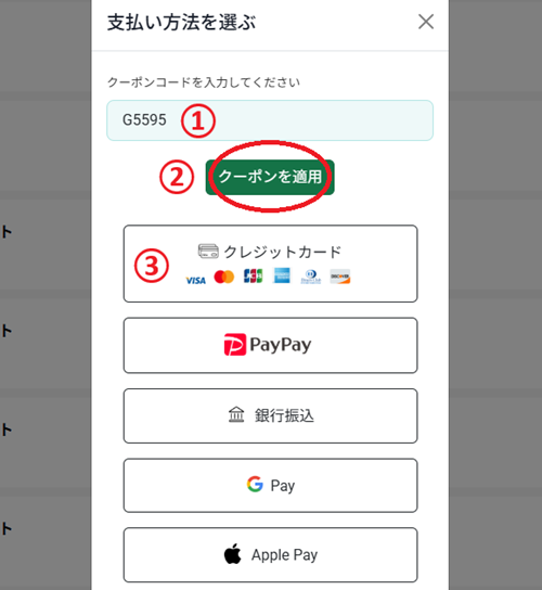 クーポンコードの入力方法と使い方は以下の手順で↓