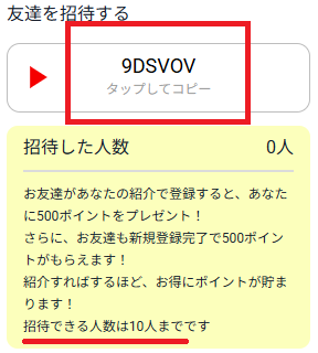 1つの招待コードで特典が付与されるのは最大10人までです。