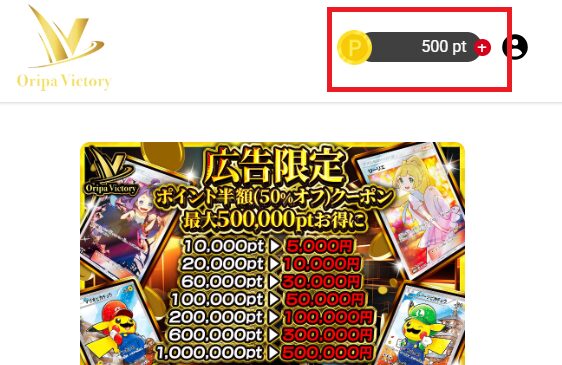 オリパビクトリーは100pt前後のオリパもあるため、まずは無課金でガチャることができます