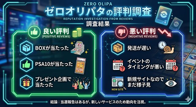 一方で、イベントのタイミングが悪いといった口コミや、発送が遅いというオリパショップならではの悪い口コミもありましたが、全体的な評判は今のところ(2026年4月現在)良かったです。